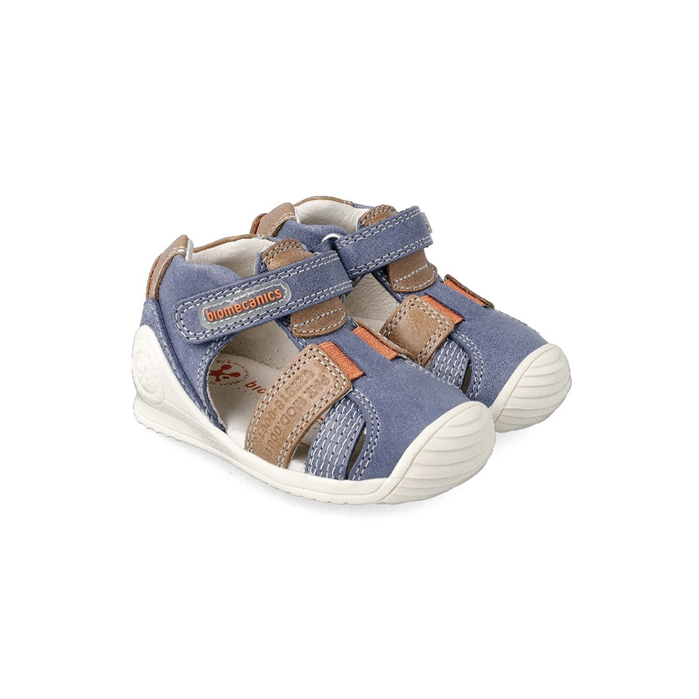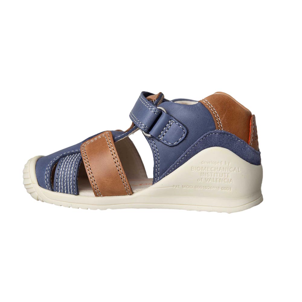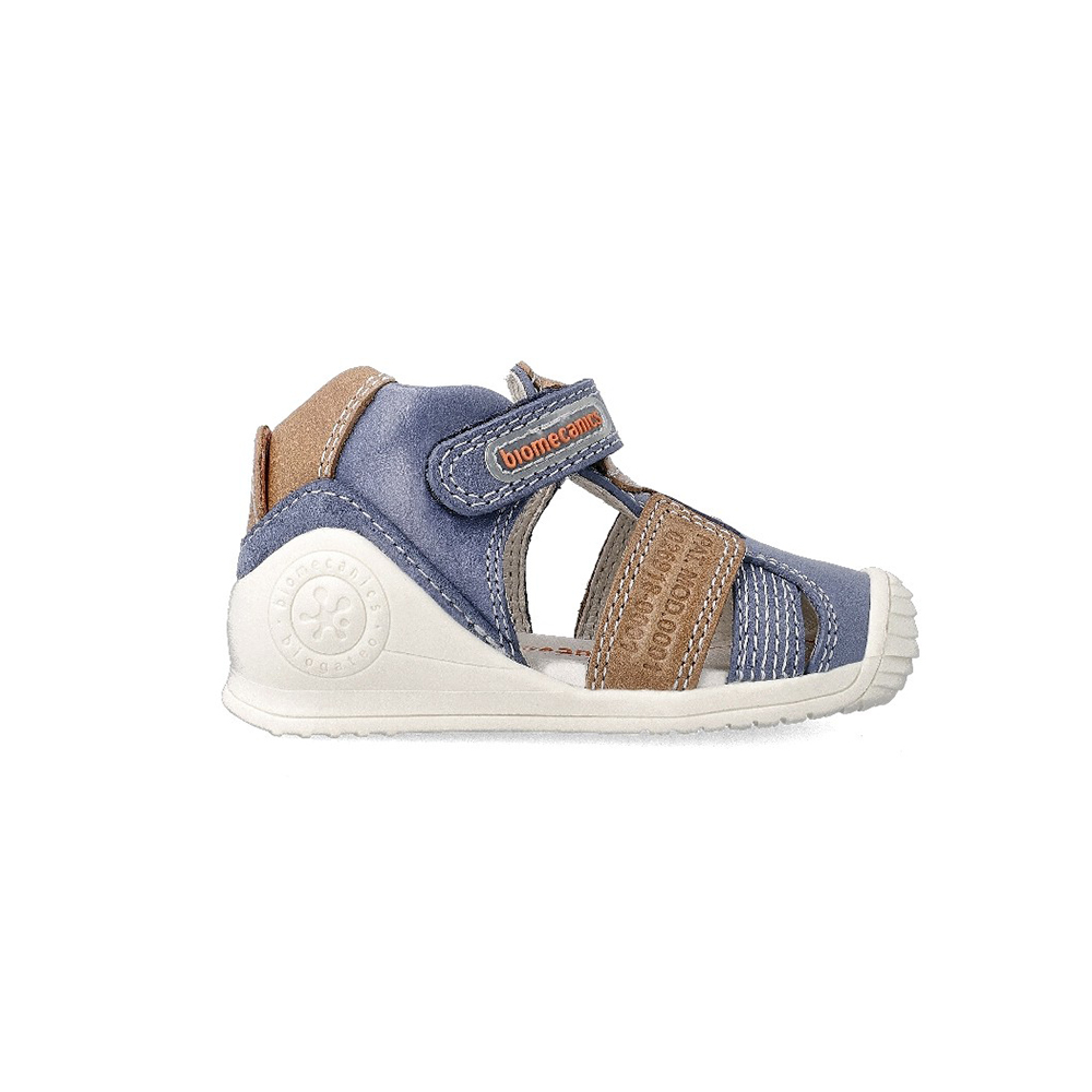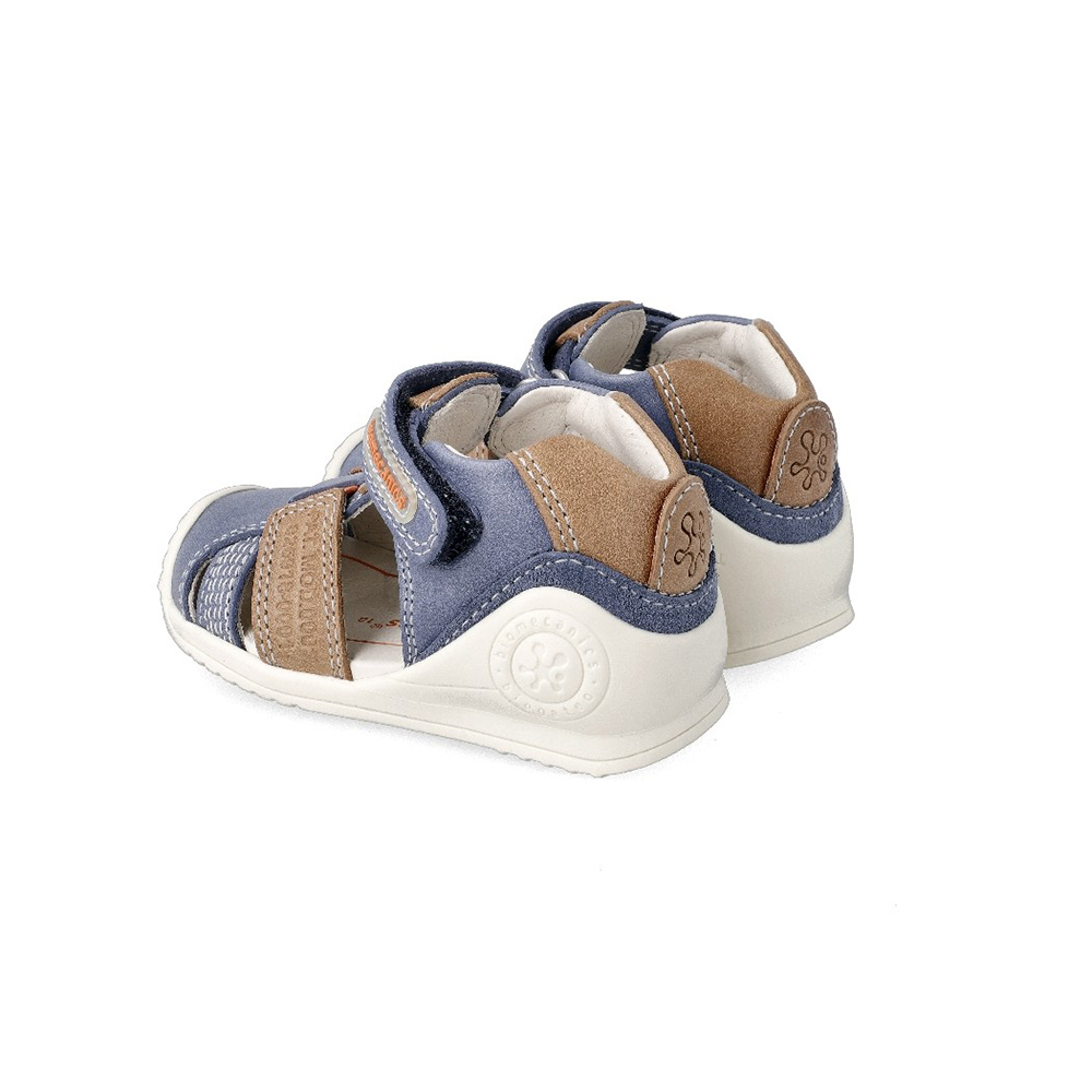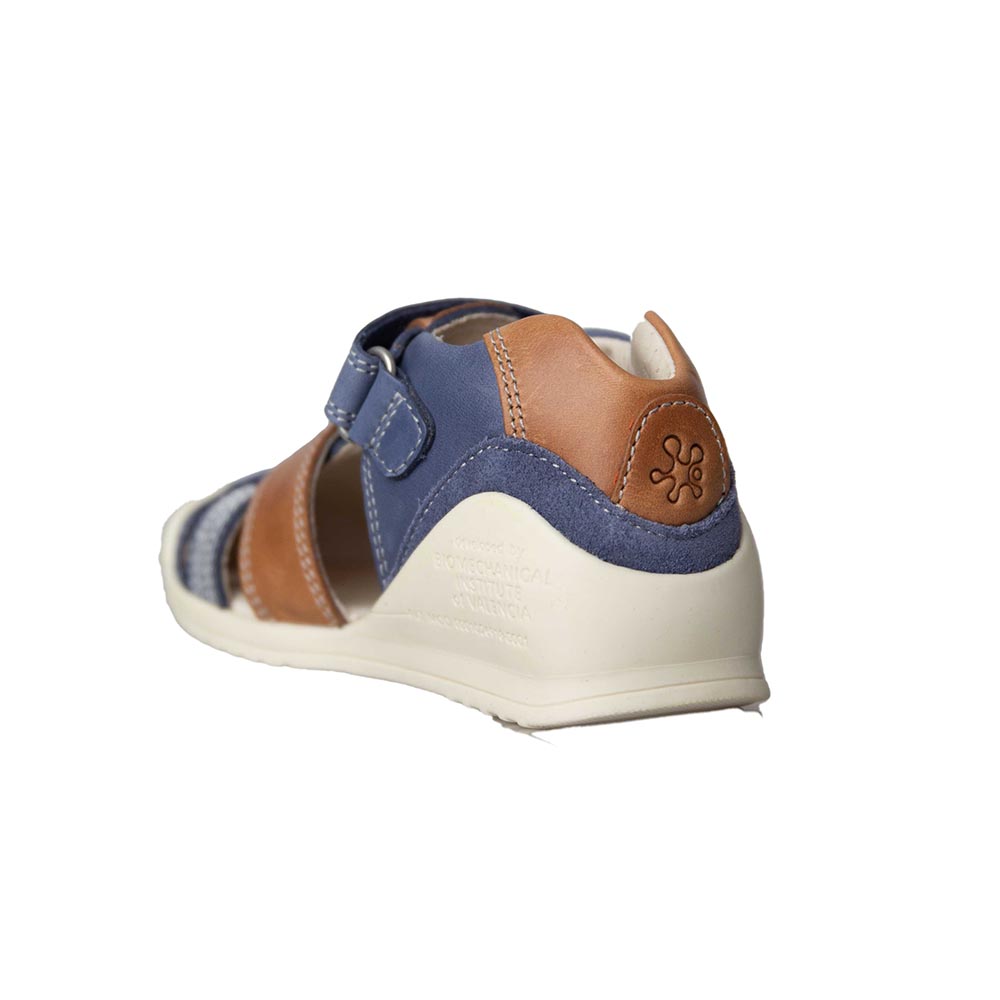 Sandalias cangrejeras de piel especialmente desarrolladas para los primeros pasos. Tiene cierre ajustable y tira elástica sobre el empeine que se adaptará a la anchura del pie de nuestros niños.
