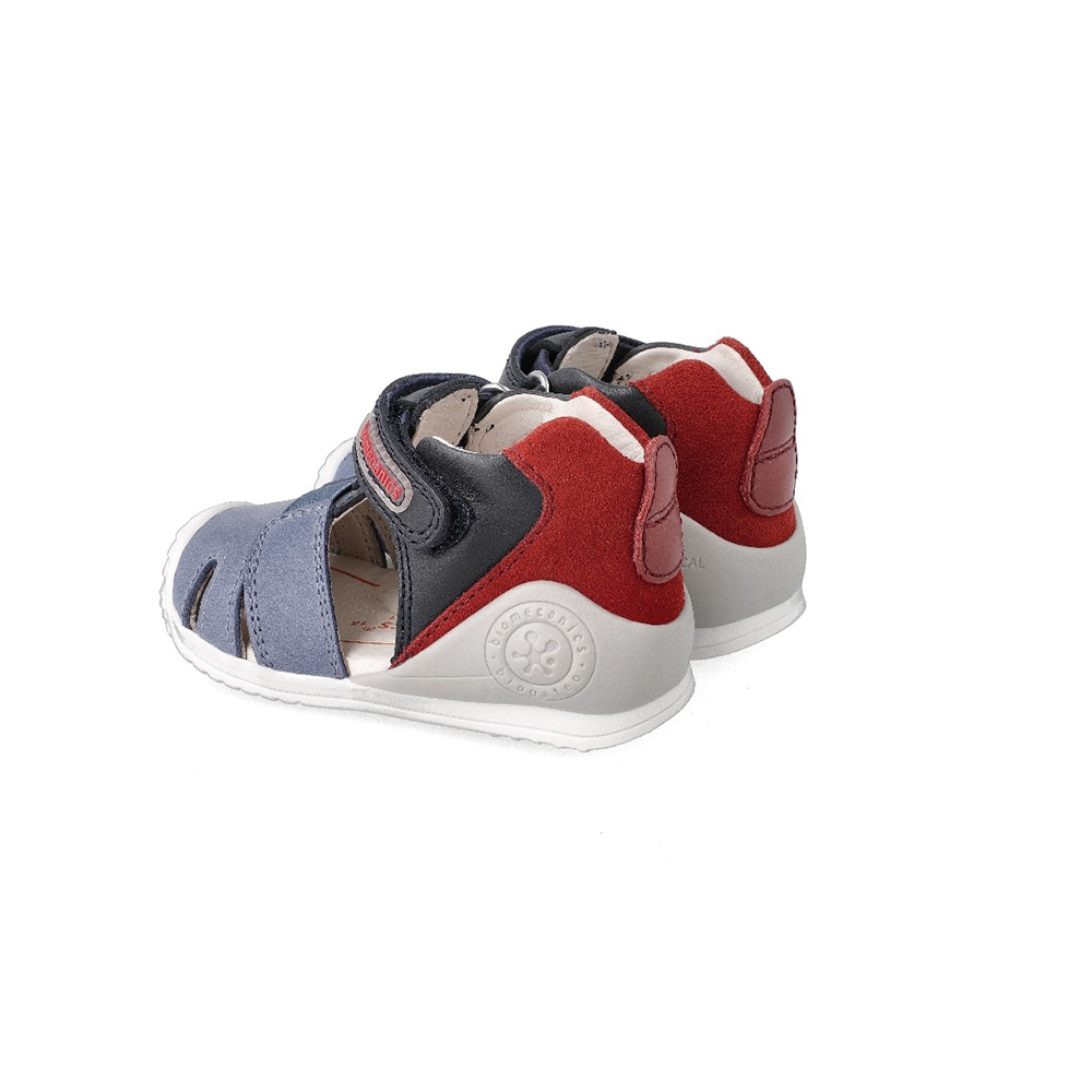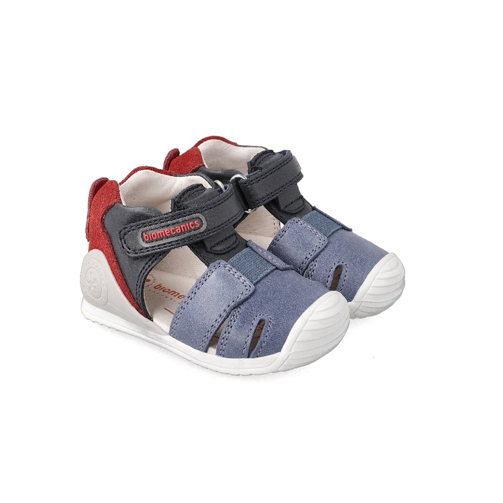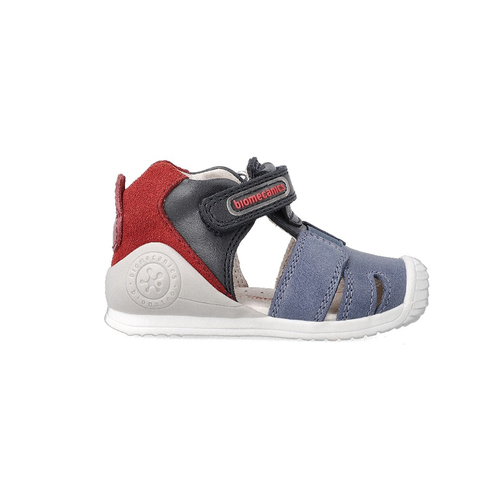 Sandalias cangrejeras fabricadas en piel tricolor. Un calzado infantil perfecto para los primeros pasos e inicio de la marcha. Tiene cierre ajustable y tira elástica sobre el empeine que se adaptará a la anchura del pie de nuestros niños.