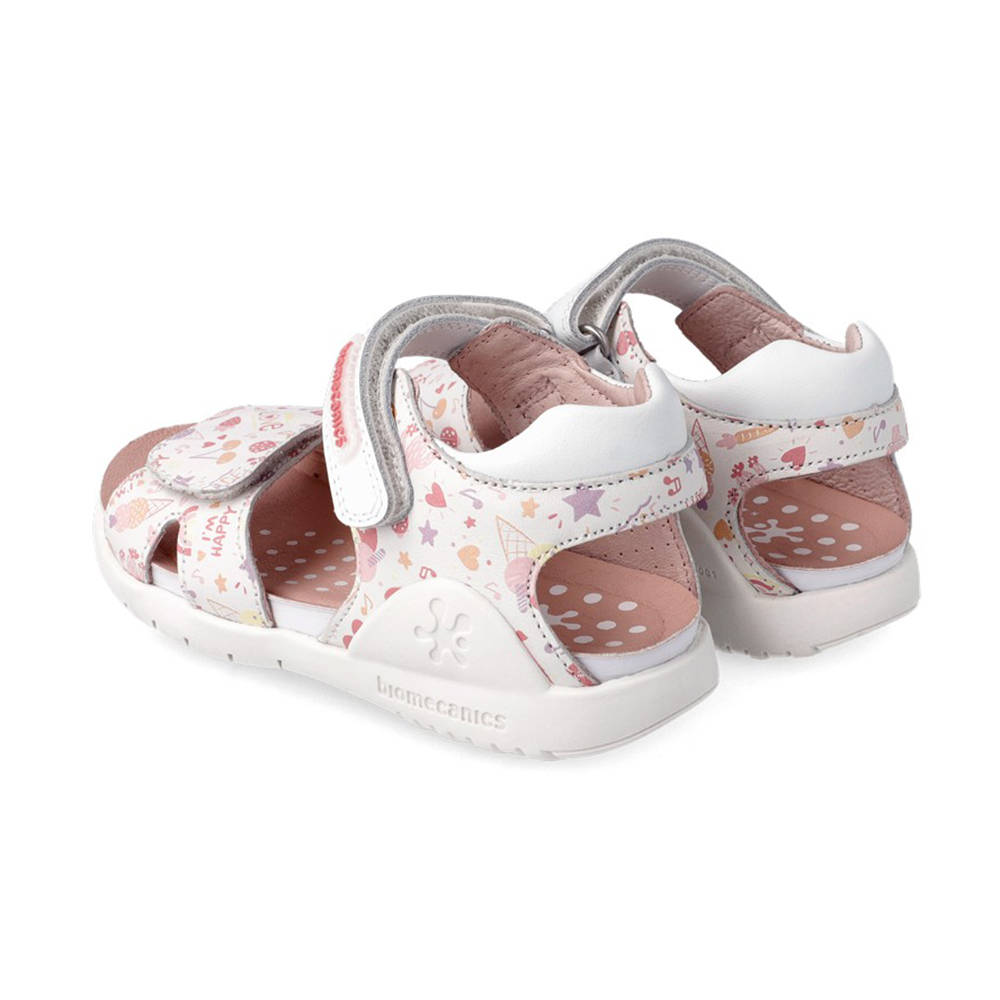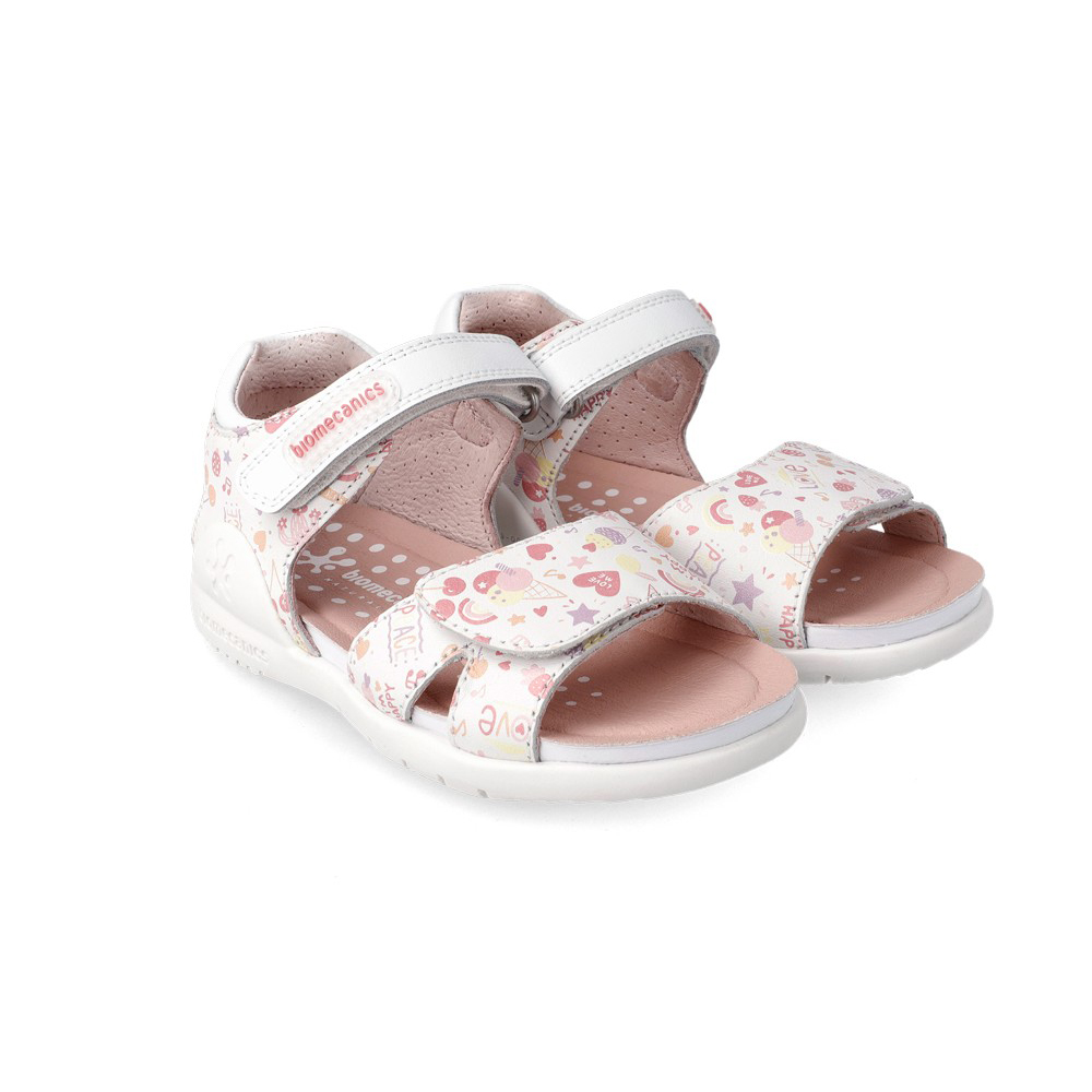 Sandalias para niña fabricadas en piel con un coqueto estampado. Ideales para los días más calurosos de la temporada. Un calzado que se amoldará al pie de manera perfecta gracias a tu tira delantera ajustable.