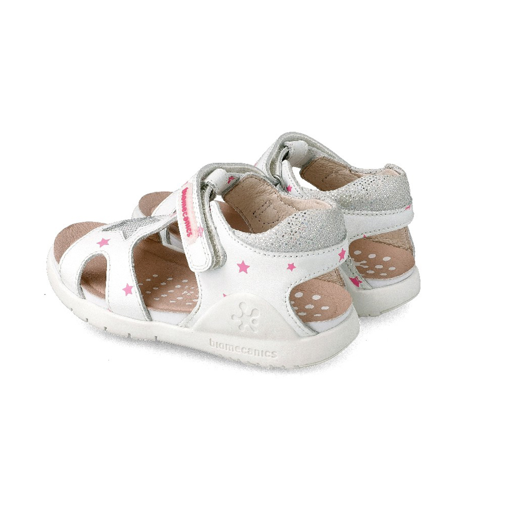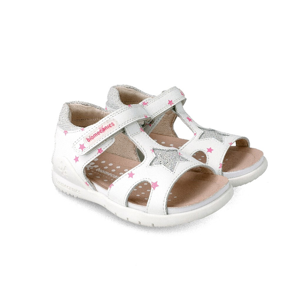 Sandalias para niña fabricadas en piel con estrellas decorativas. Ideales para los días más calurosos de la temporada. Recogerán el pie de manera perfecta gracias a su tira central y a su cierre ajustable.