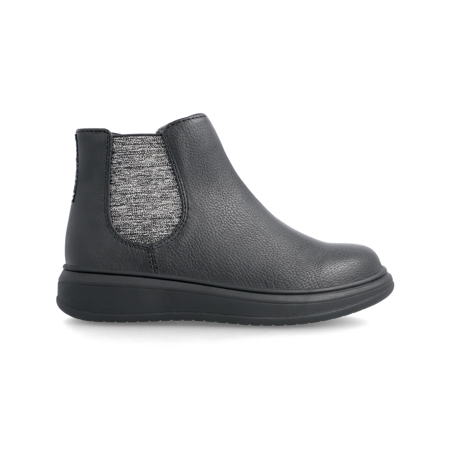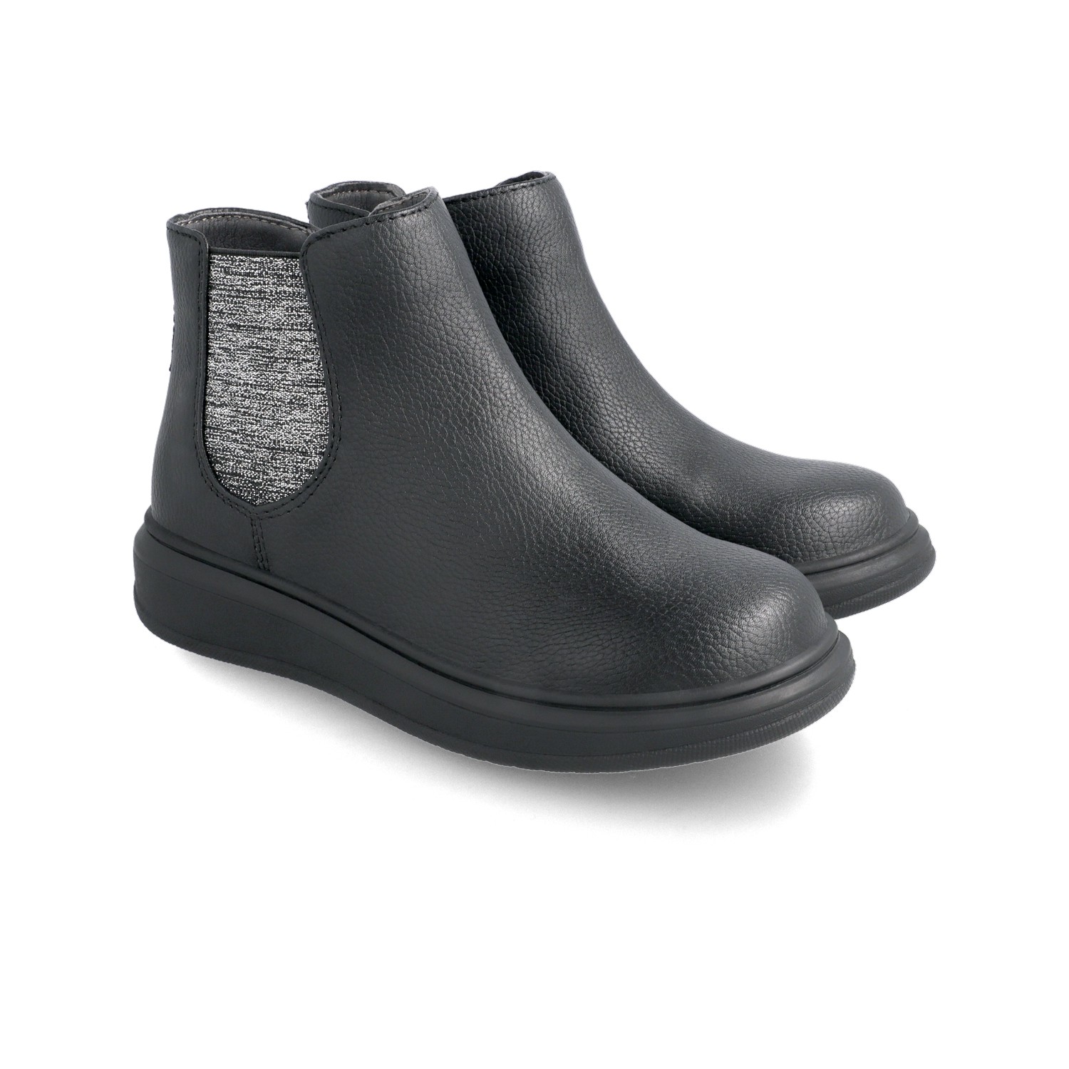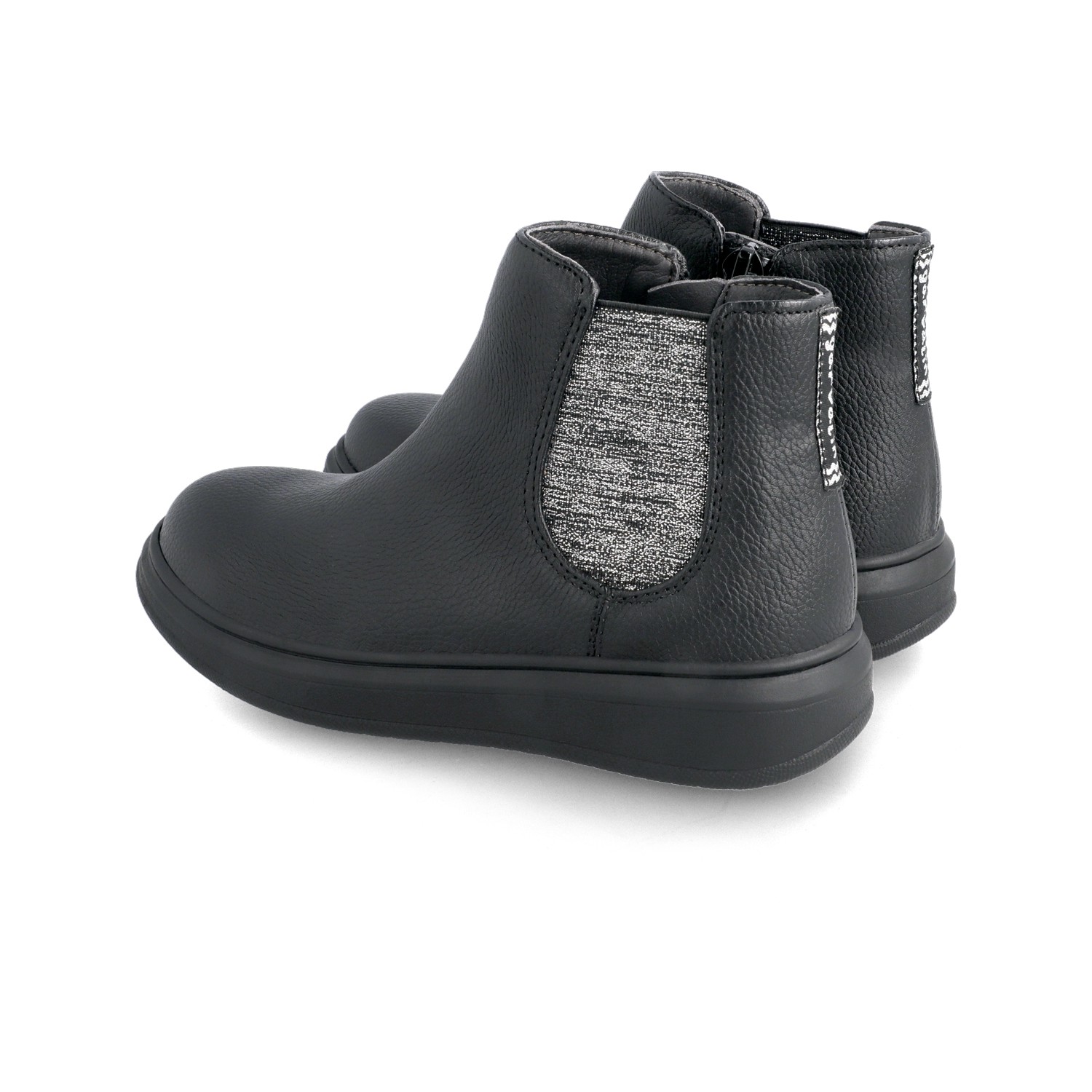 Sencillo botín negro para niña realizado en materiales de primera calidad resistentes y transpirables. Presenta elástico lateral que acompaña el cómodo cierre con cremallera para que las peques puedan poner y quitarse el calzado ellas solitas.