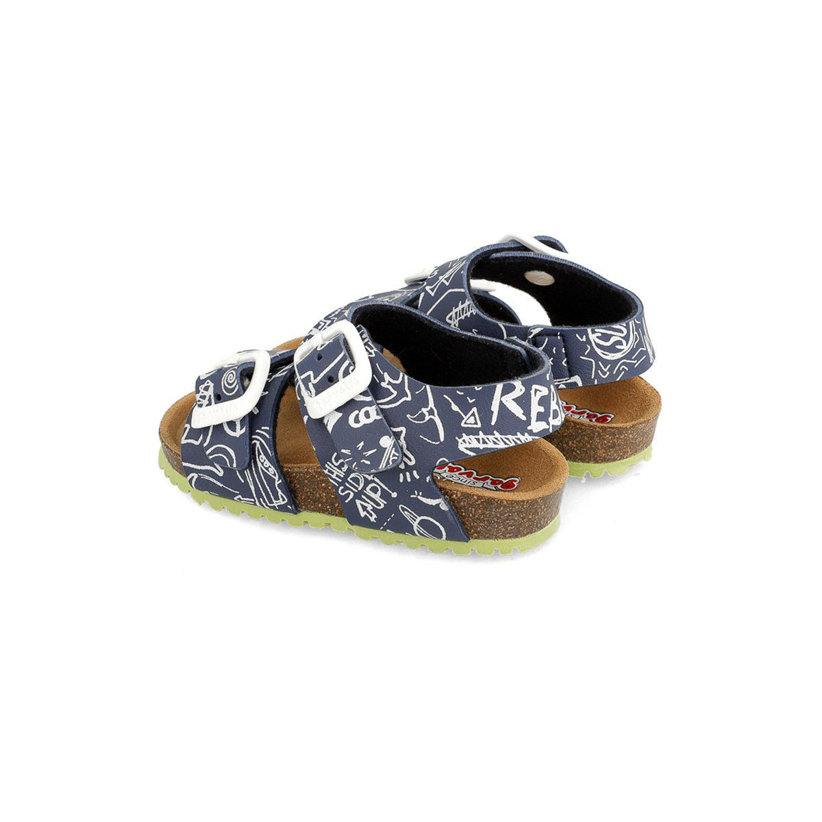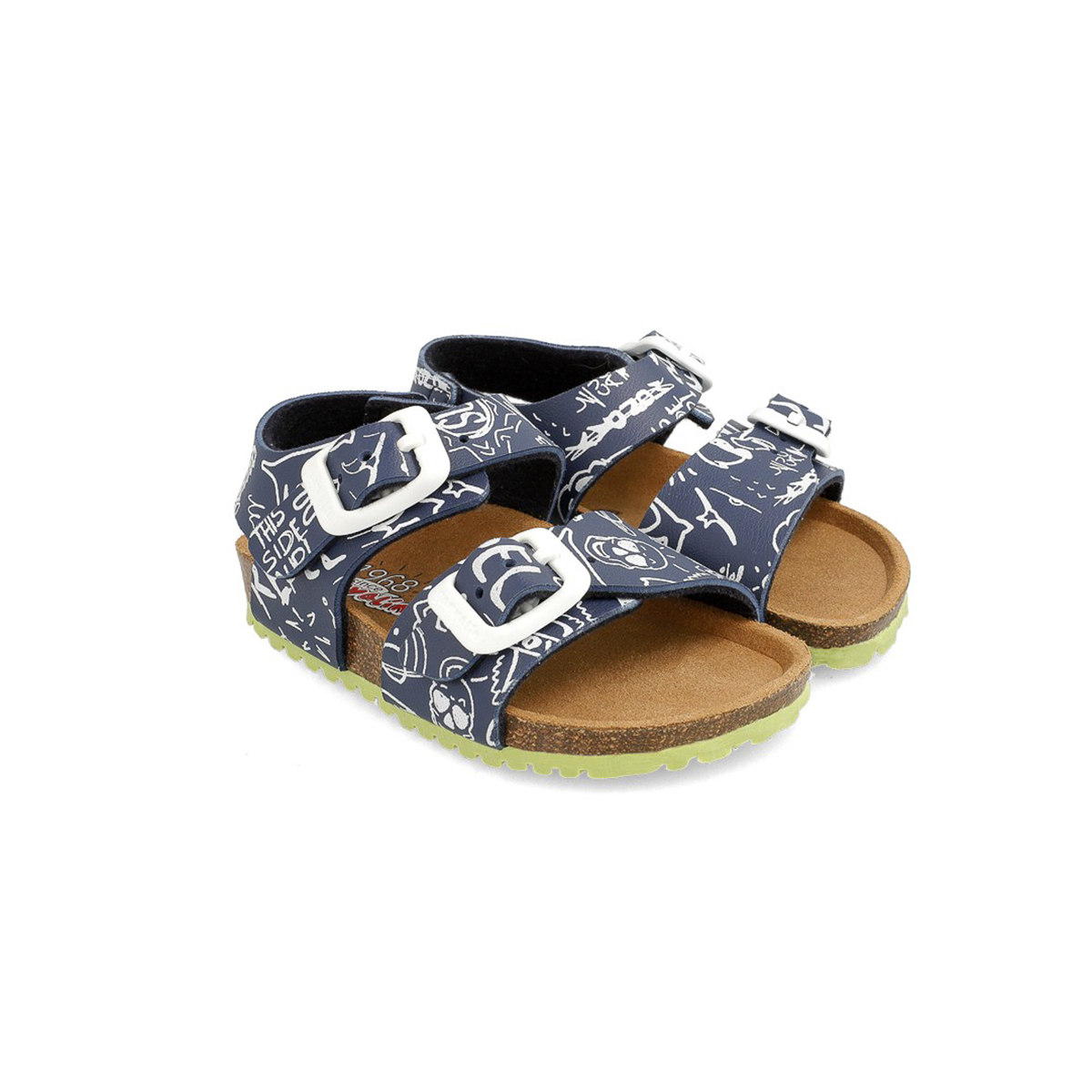 Divertidas sandalias para niño fabricadas en un resistente material sintético con suela dentada y cierre con correas ajustables. Presentan un estampado tipo grafitti combinado con el color de las hebillas.