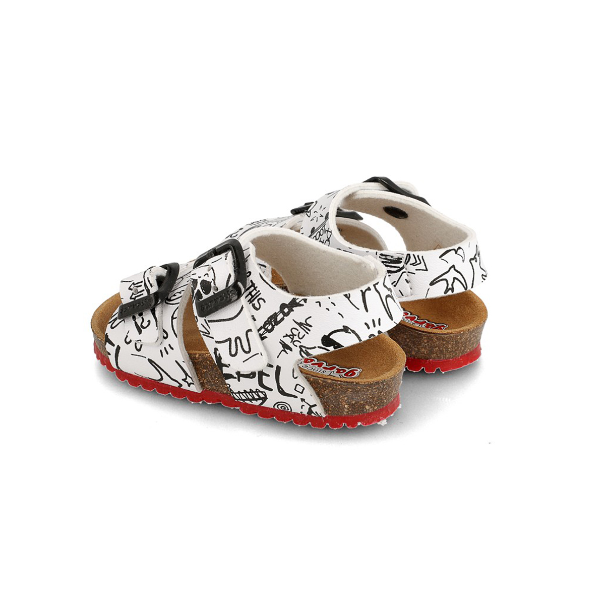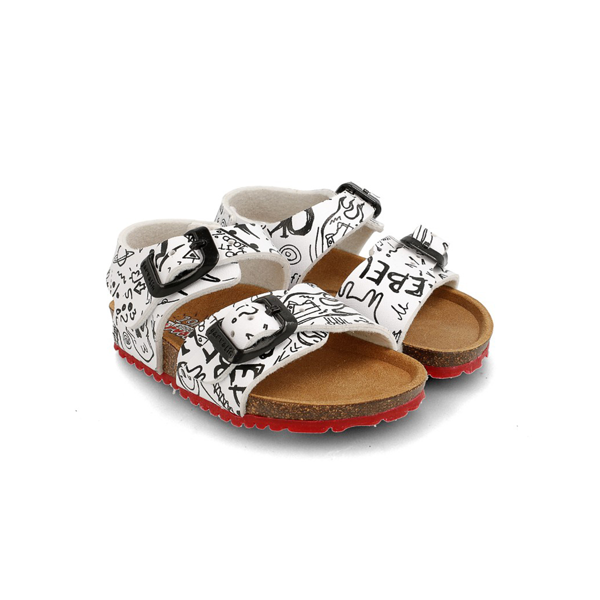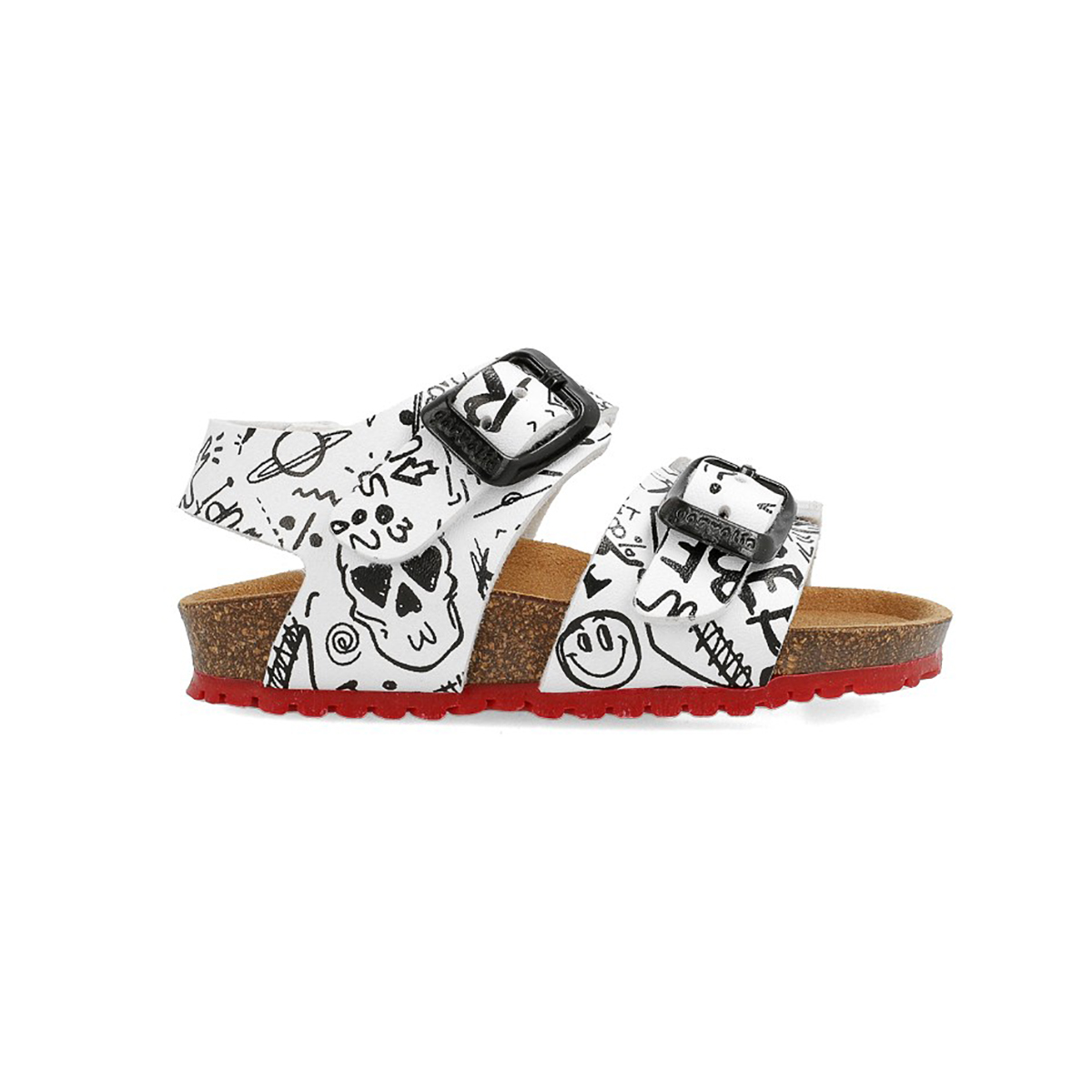 Divertidas sandalias para niño fabricadas en un resistente material sintético con suela dentada y cierre con correas ajustables. Presentan un estampado tipo grafitti combinado con el color de las hebillas.
