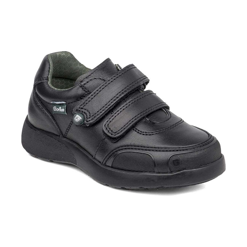 Zaptos de colegial para niño. Zapato de color negro con refuerzo en la puntera y cierre de doble velcro para un ajuste perfecto y fácil para el uso de los niños en piel hidrofugada. Preparados para darle un uso intenso, siendo perfectos para el día