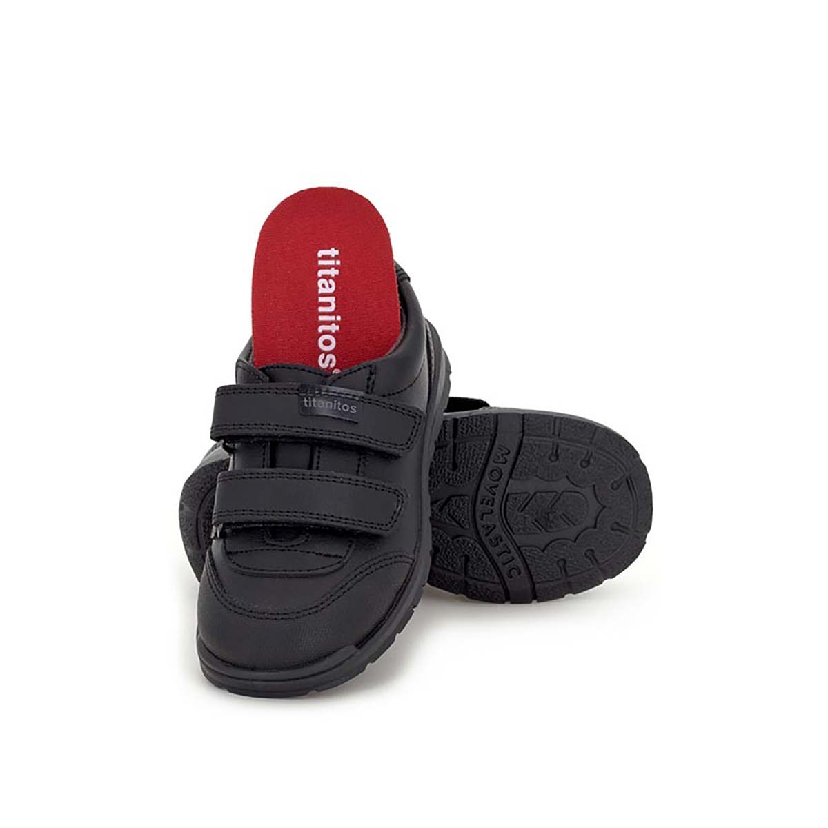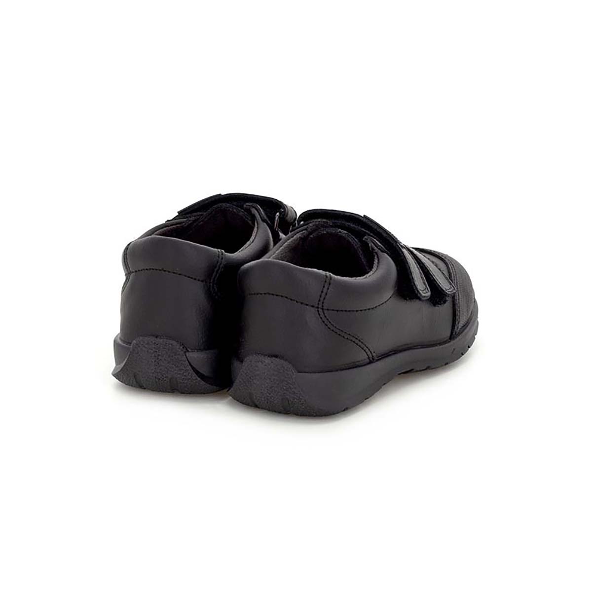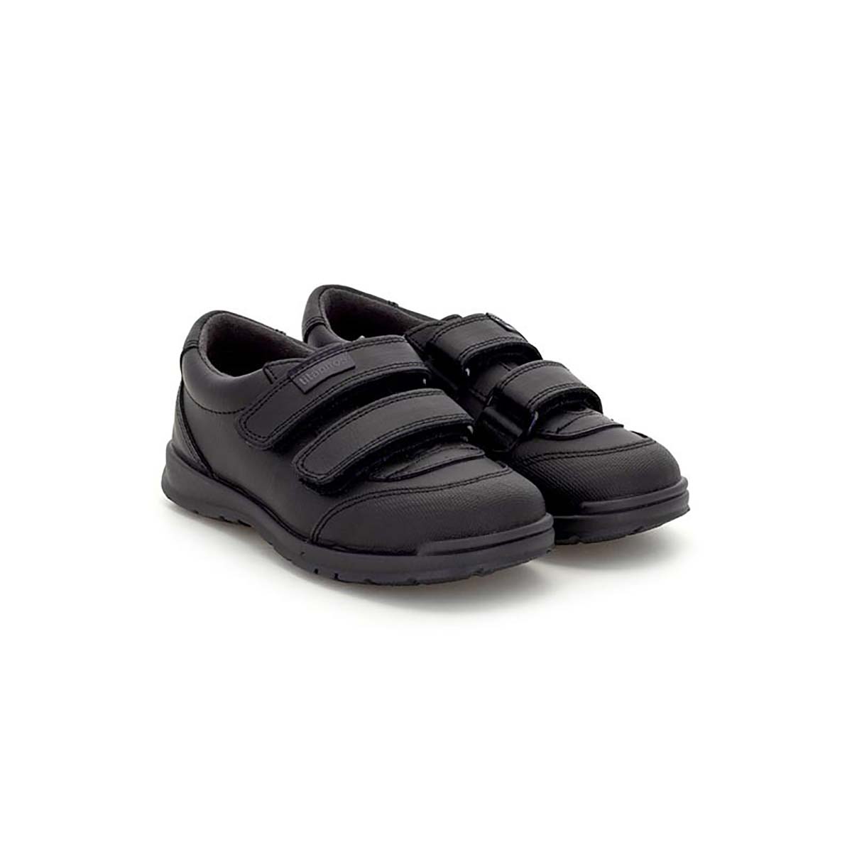 Zaptos de colegial para niño. Zapato Apolo de color negro con refuerzo en la puntera y cierre de doble velcro para un ajuste perfecto y fácil para el uso de los niños en piel hidrofugada. Preparados para darle un uso intenso, siendo perfectos para el día